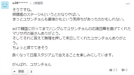 그런 유상철씨에 대해서 친청팀이었던 요코하마F 마리노스의 서포터가 12일 AFC 챔피언스 리그 개막전인 전북 현대전에서 "힘내라! 유상철"이라고 적은 현수막을 걸어 리그 우승에 크게 공헌 한 전 한국대표 지도자에게 응원 메세지를 보냈었다.