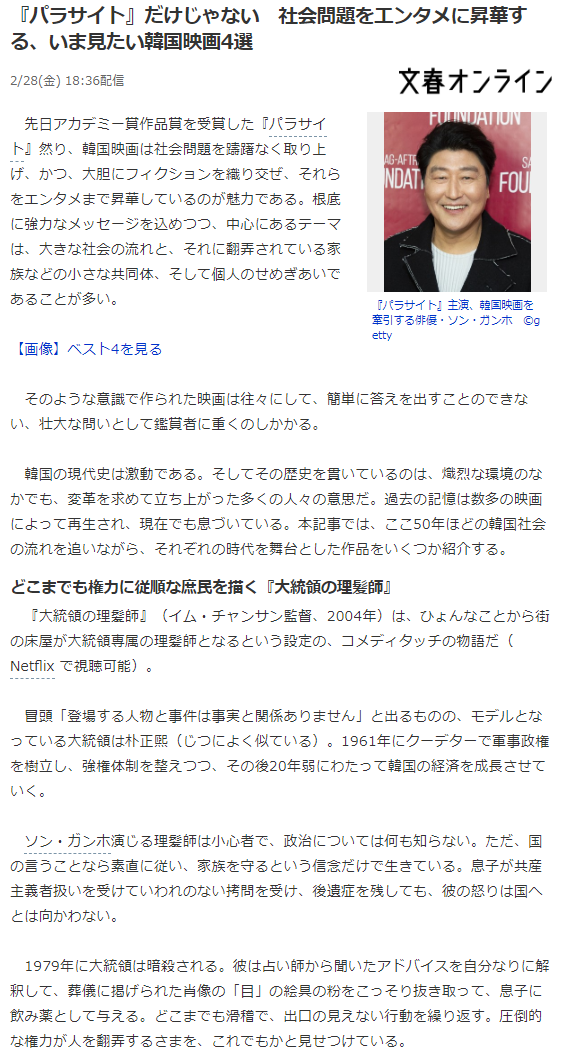 기사의 제목은 '기생충' 뿐이 아닌 사회문제를 엔터테인먼트로 승화한 지금 보고 싶은 한국영화 4선'입니다.