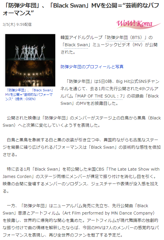 자 이번 시간에는 "방탄소년단" "Black Swan" MV를 공개 = "예술적인 퍼포먼스" 라는 제목의 기사에 대한 내용과 일본 네티즌 반응 살펴보시겠습니다.